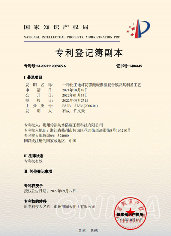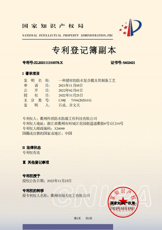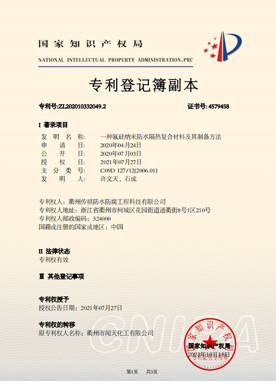 衢州傳祺新材料科技有限公司是衢州市聞天化工有限公司的下屬企業(yè);衢州市聞天化工有限公司成立于2003年,是國內(nèi)最早研發(fā)、生產(chǎn)氟碳涂料的企業(yè)之一。衢州傳祺新材料科技有限公司成立于2017年,公司專注于高分子氟材料的開發(fā)和含氟材料在防腐、防水領(lǐng)域的應(yīng)用。經(jīng)過6年的不懈努力,已獲得了化工和建筑領(lǐng)域六項國家發(fā)明專利授權(quán)和兩項新產(chǎn)品科技成果獎,參與了中國建筑材料流通協(xié)會《房屋修繕防水工程規(guī)范》標準的編制工作,中建協(xié)涂裝委員會浙西工作站設(shè)立在我公司。
